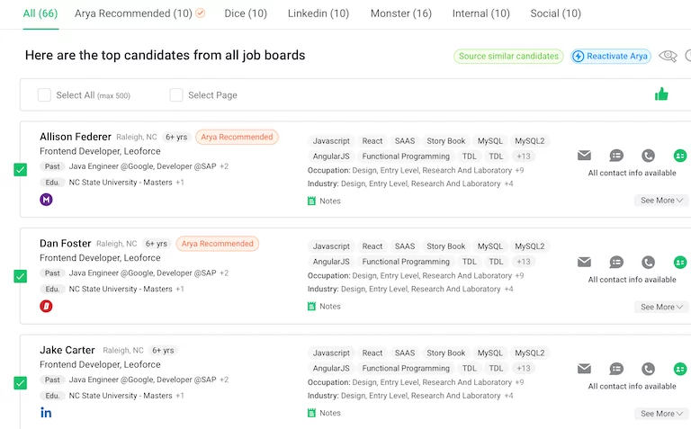 Arya AI quickly analyzes data from your own database, subscribed candidate sources, social sites, and more than 800 million profiles from 50+ professional sources to highlight the most compatible candidates. - See more compatible candidates