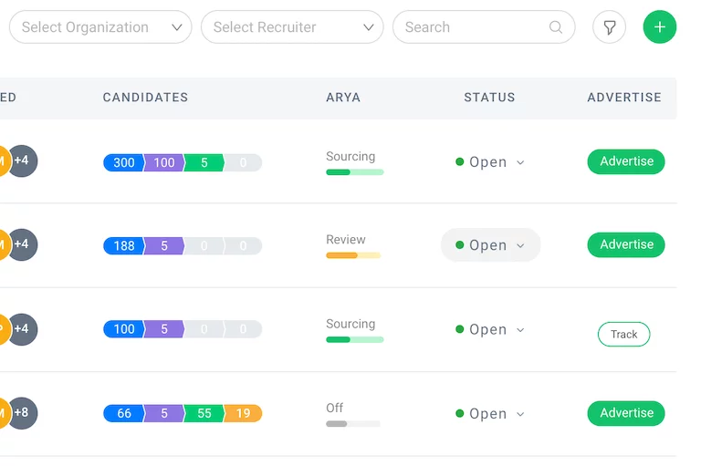 Only Arya delivers Artificial Intuition, yielding deeper insights into candidates by analyzing more than 300 attributes other AI tools may ignore. - Streamlined candidate engagement dashboard