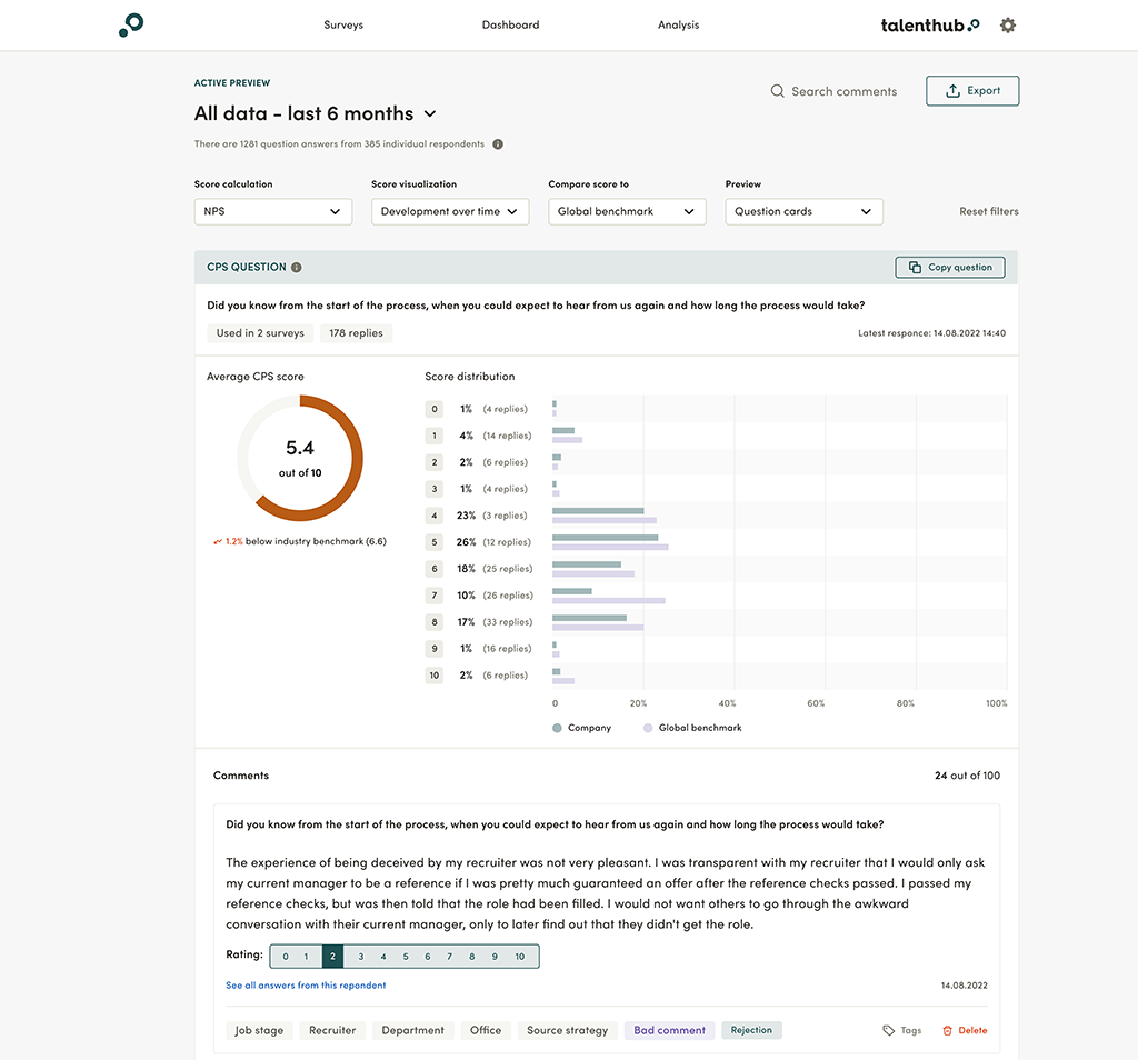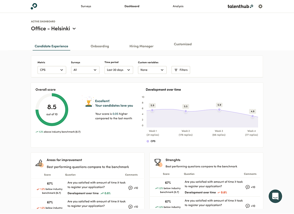 Through the integration with Jobvite, the Talenthub platform will automatically send relevant surveys to your candidates as they proceed from stage to stage. Depending on your needs, this could simply mean following the usual stages of application, interview and hiring, but it could also include setups like hiring manager, onboarding surveys or department-specific surveys.