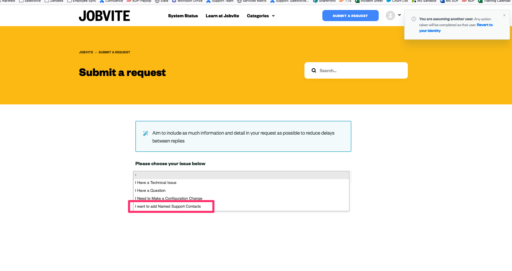 Navigate to the Jobvite Help Center and click on the link, Submit a Request. Then, in the “Please choose your issue below” dropdown, select I want to add Named Support Contacts to update your information.