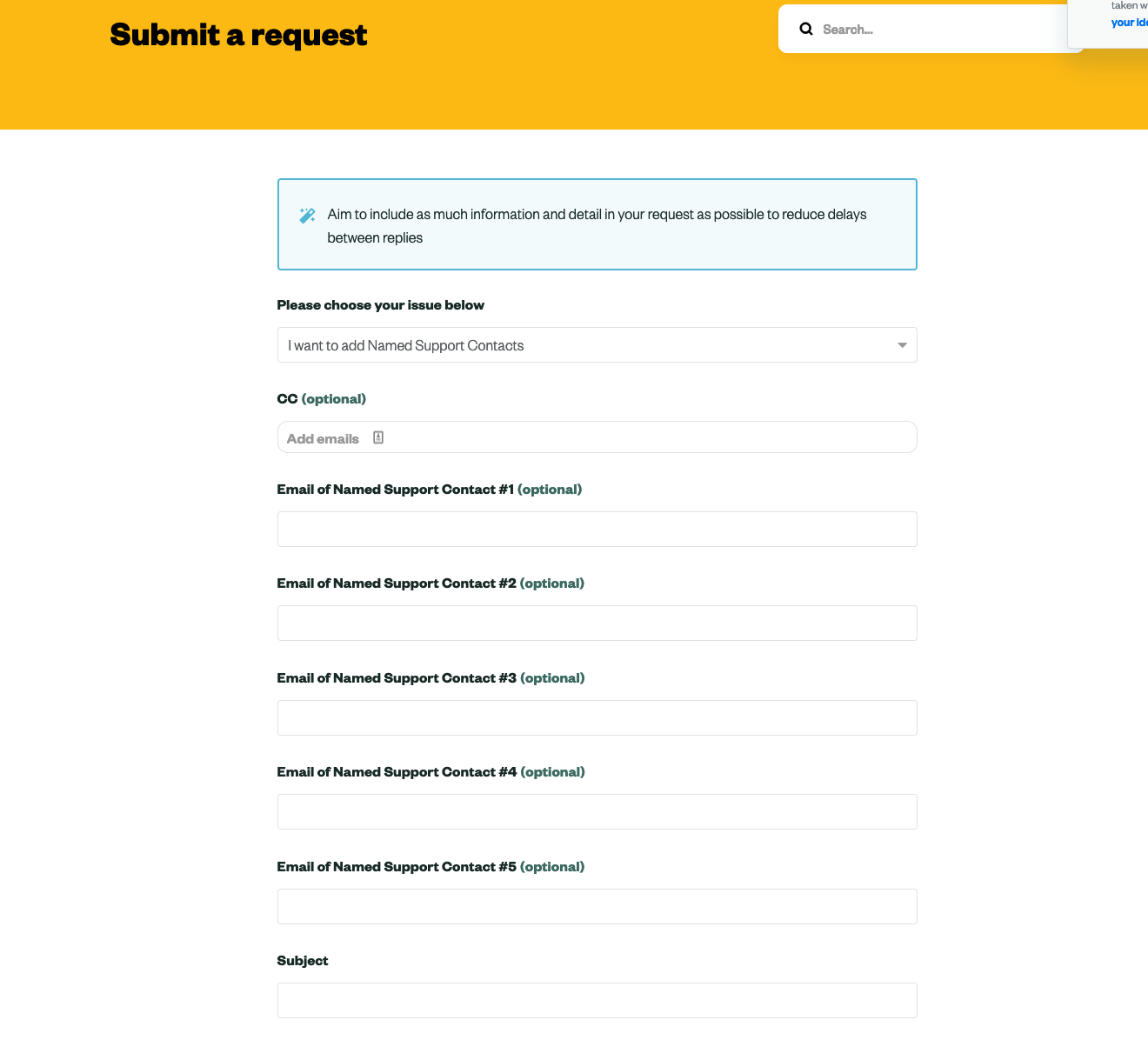 - In the “Please choose your issue below” dropdown, select I want to add Named Support Contacts